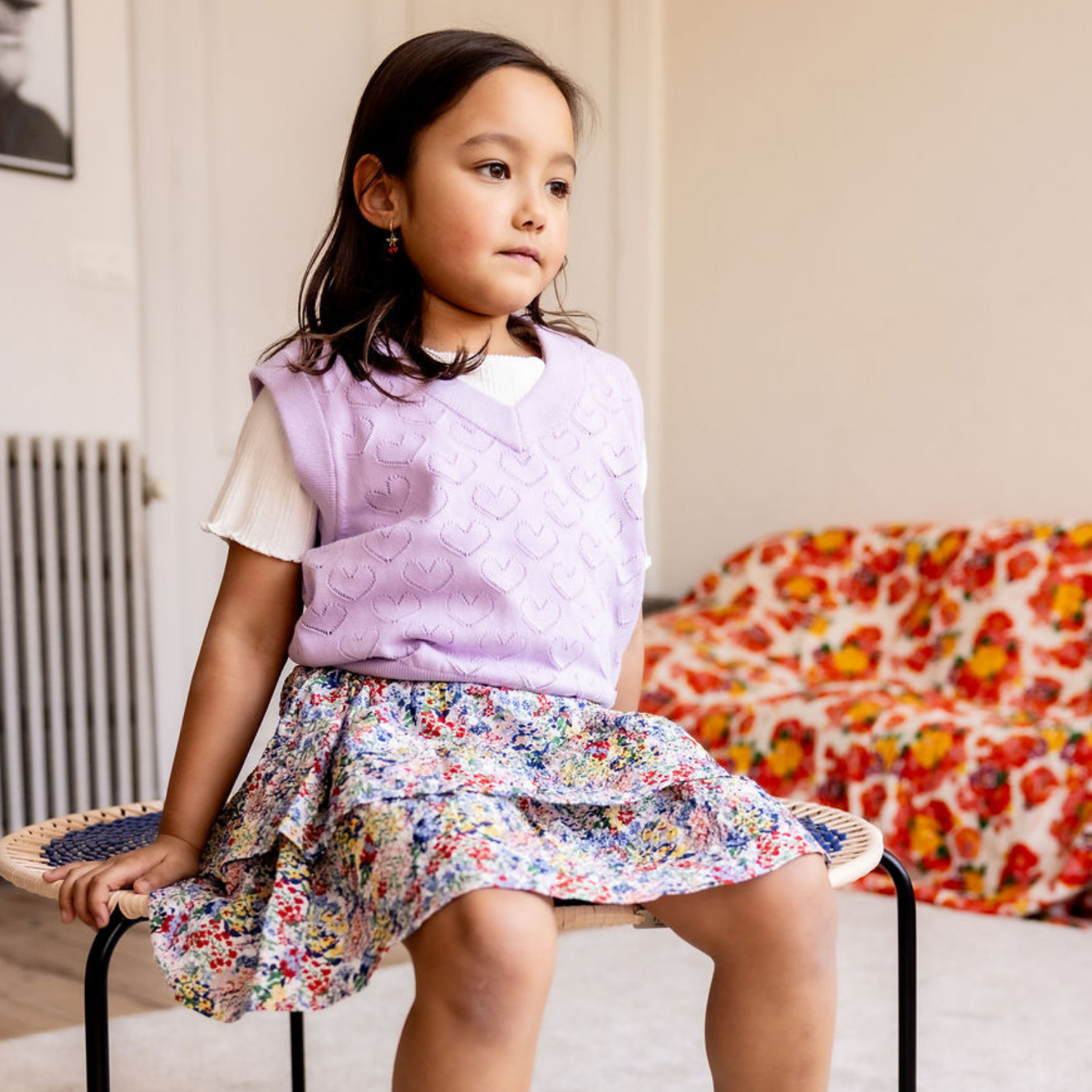 Pairing a sweet, lilac knitted vest by Repose featuring the cutest textured heart pattern over a classic ribbed white tee from The New Society.