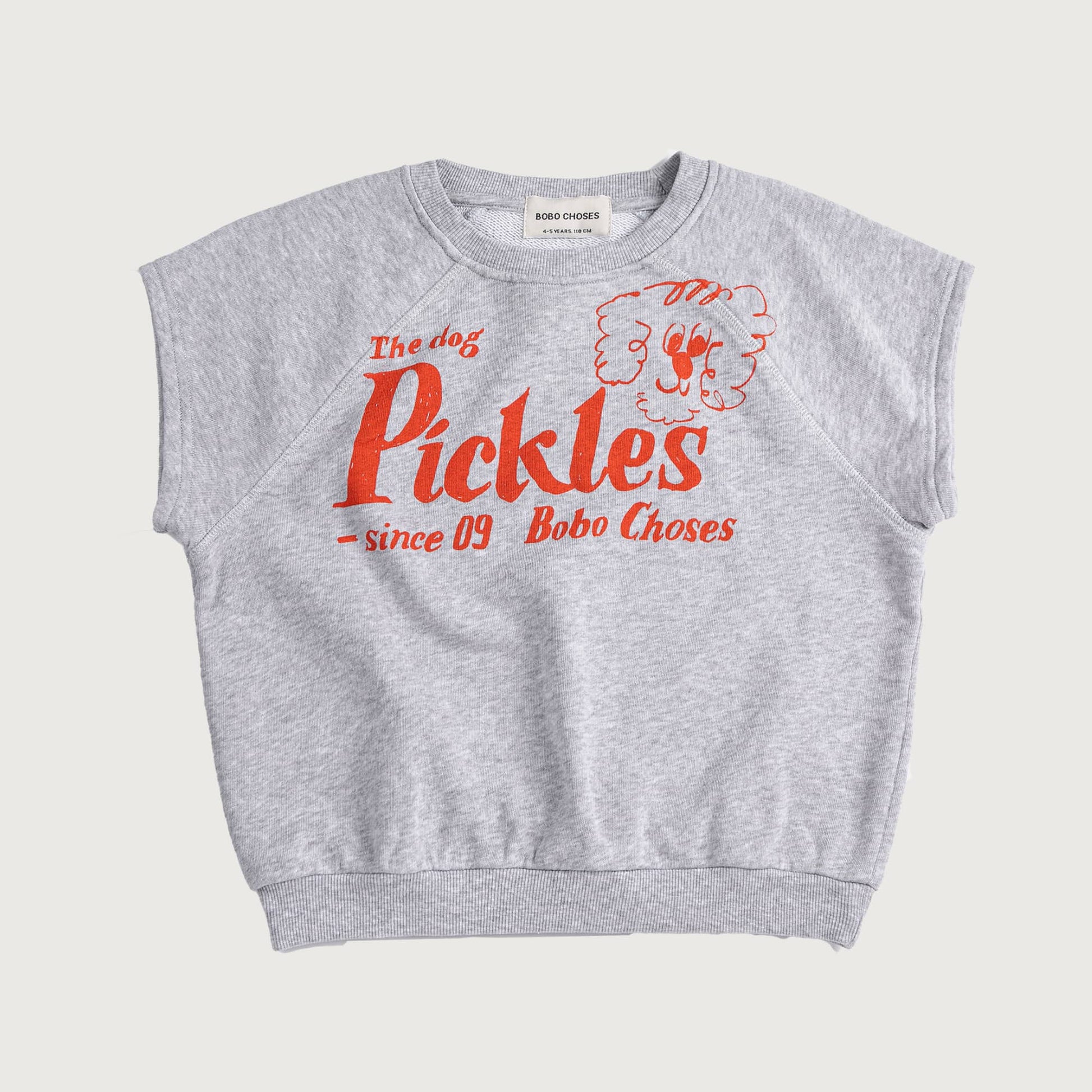 The sweatshirt features a classic, heather grey base that pairs with absolutely everything. But it wouldn't be Bobo without a pop of fun: bold orange "Pickles" text announces the star of the show, accompanied by a charming dog graphic print. Whether worn solo on a warm day or layered over a long-sleeve tee for a skater look, it’s an instant favorite.