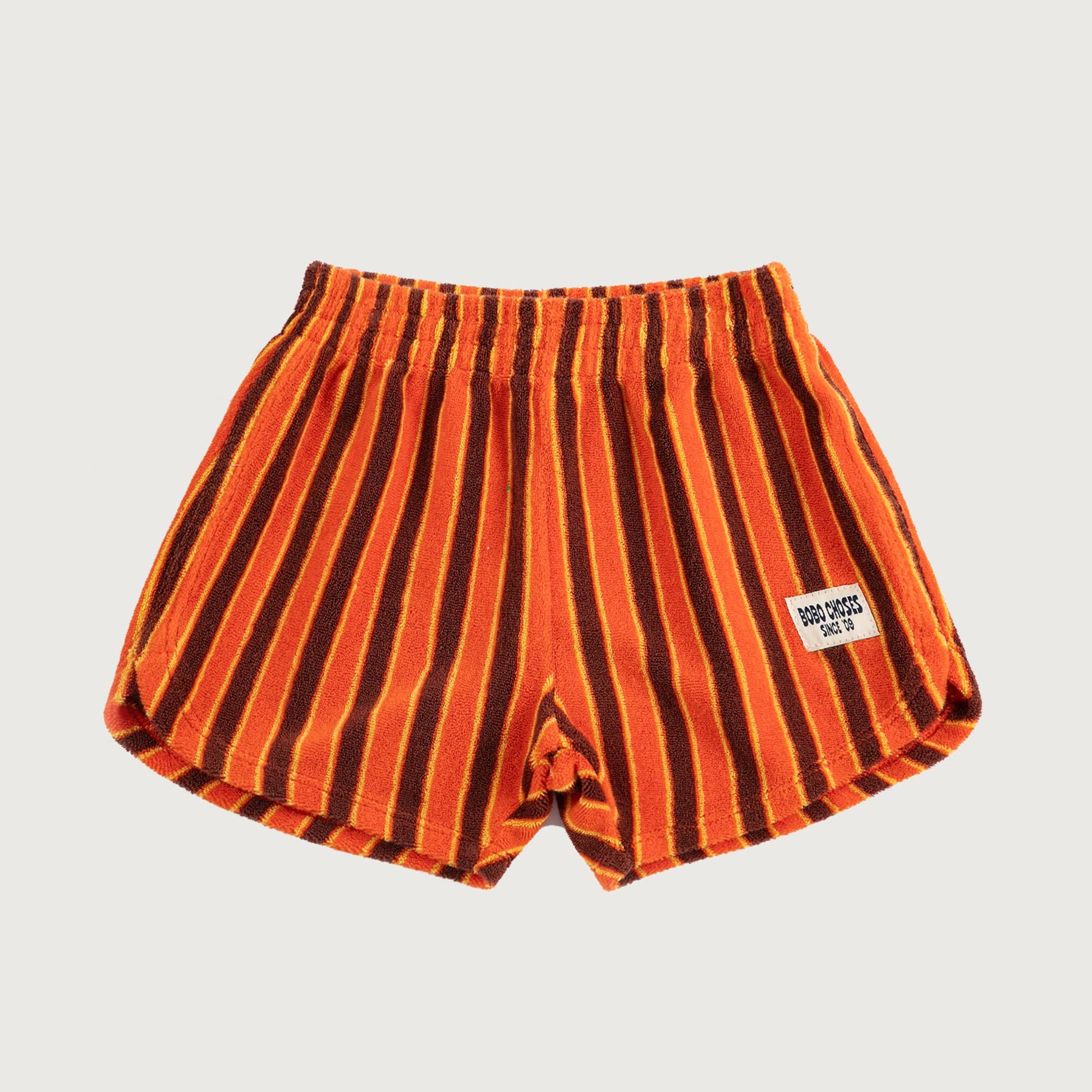 Crafted from ultra-soft terry cloth (that classic toweling texture we all love), they are as comfortable as they are cool. The design features a bold, warm stripe pattern in orange, burgundy red, and yellow. A palette that mimics a perfect summer sunset. With a relaxed fit and an easy elastic waistband, they are designed to go straight from the pool to the playground without missing a beat.