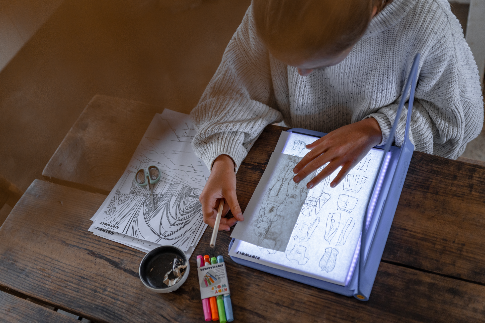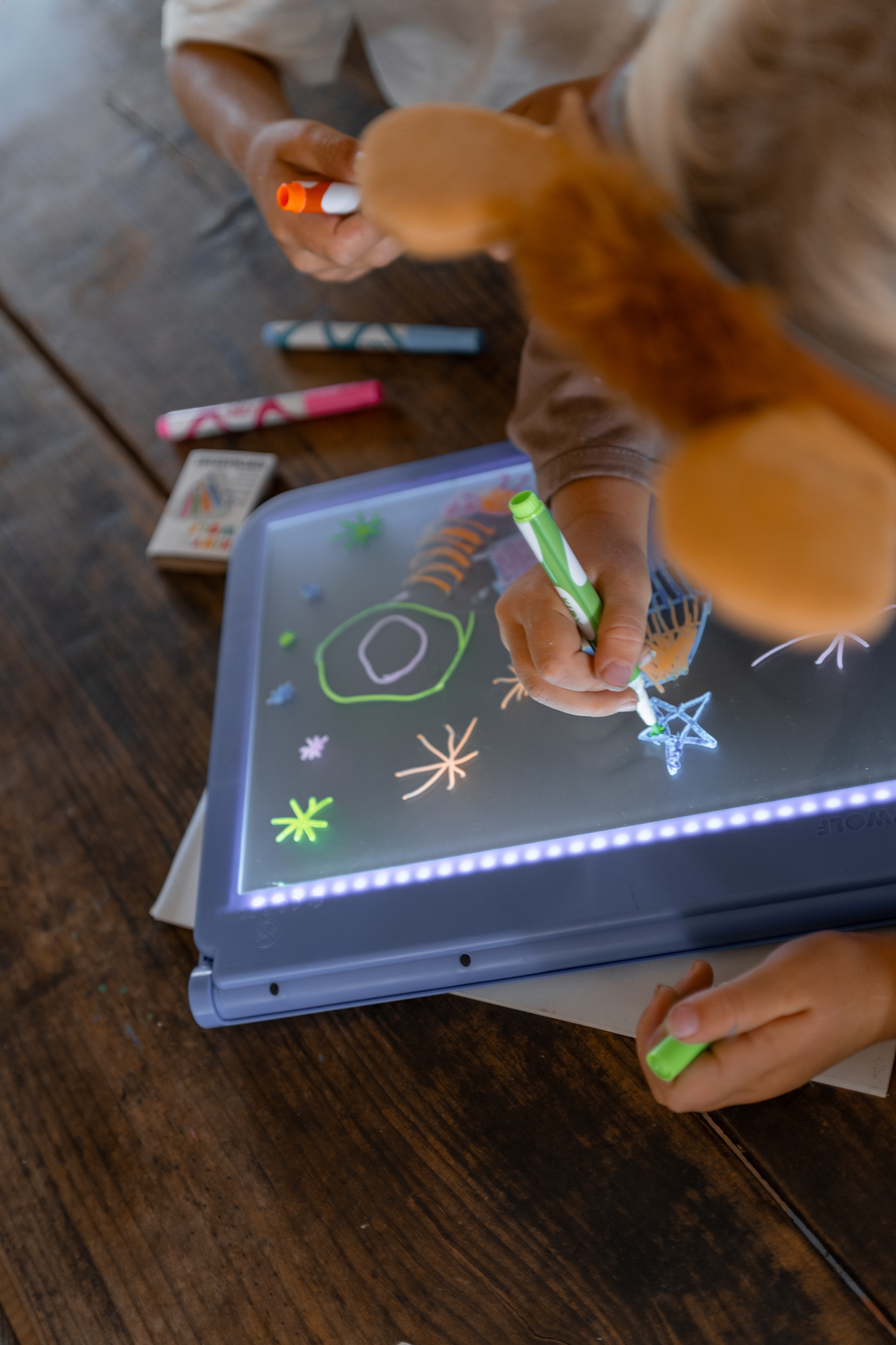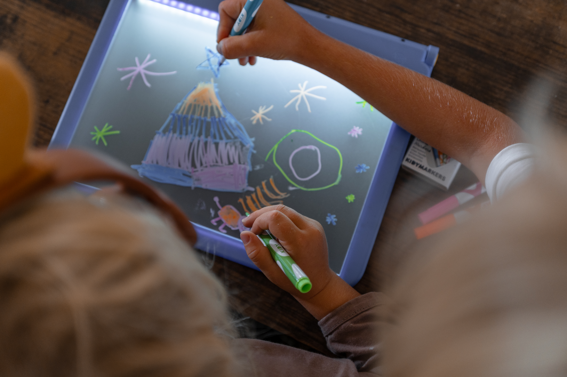 De KIDYDRAW PRO is een mobiel oplichtende tablet. Je kind kan letters, cijfers of een bestaande tekening nauwkeurig reproduceren. De 2-zijdige achterkant doet ook dienst als schoolbord met een neoneffect dat de kleuren van de tekening van je kind in het donker laat uitkomen.