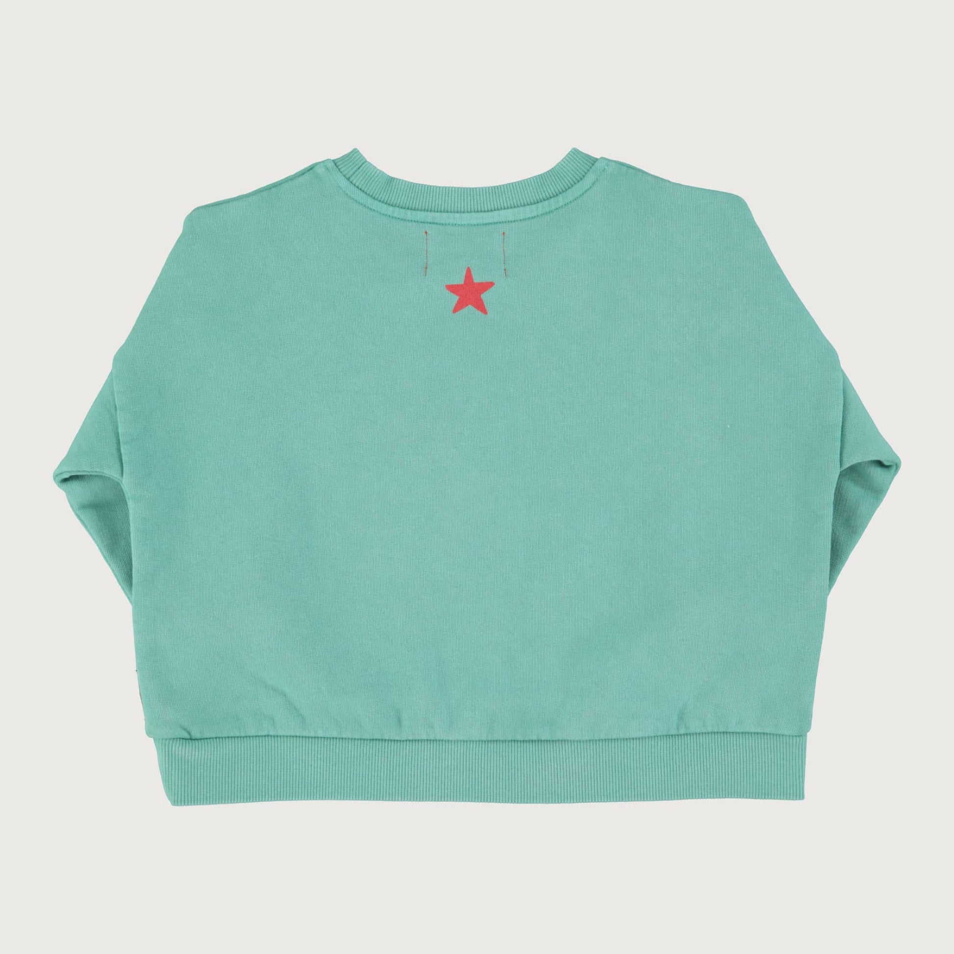 Unisex sweatshirt in organic cotton fleece and ribbed hems by the brand Piupiuchick. Frontal print and a little red logo star at back. Seam details.