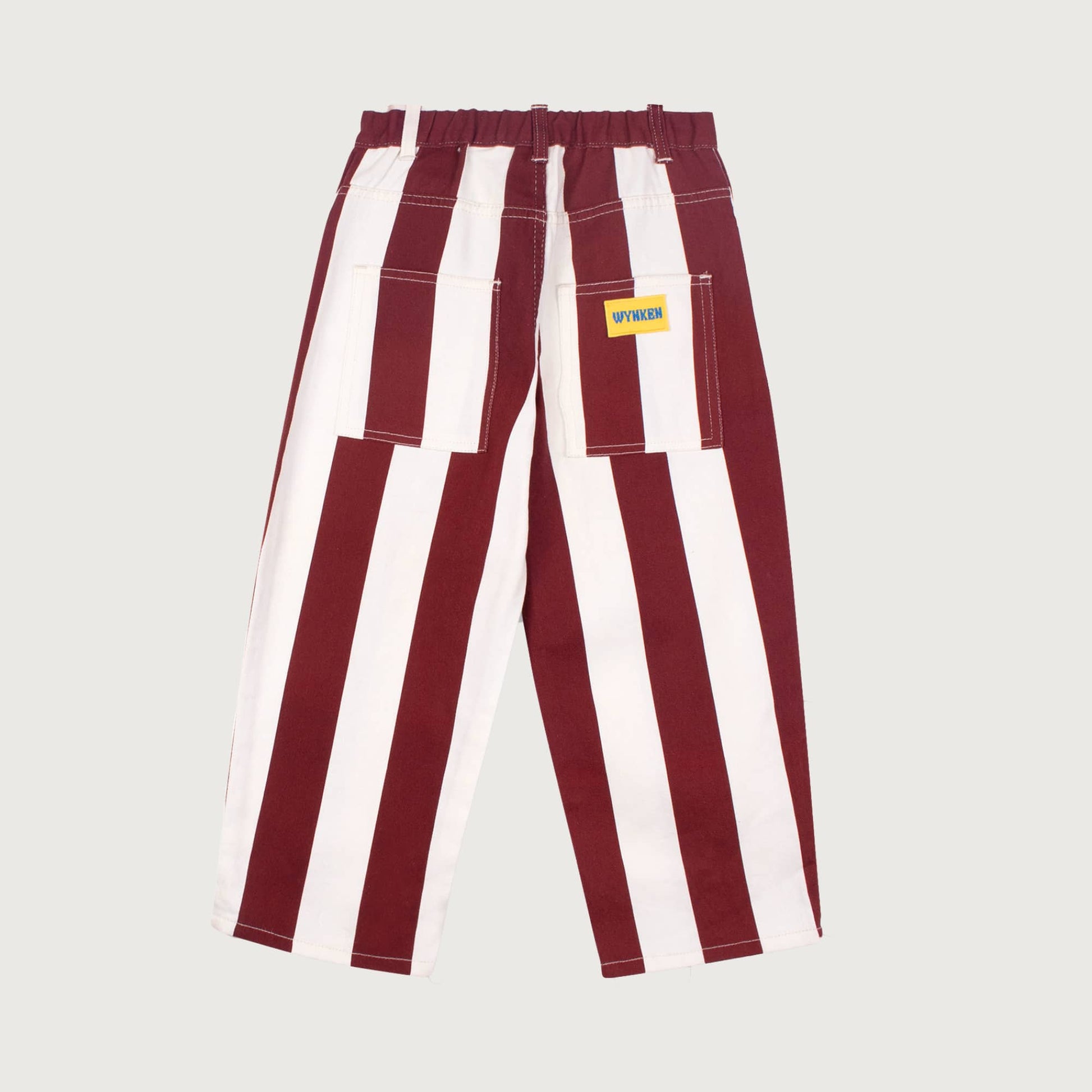 Bold bench-red vertical stripes run down the legs, giving these jeans a fresh, standout look full of summer energy. Made from lightweight 100% cotton, they feel soft and breathable for warm-weather wear. A hidden adjustable waistband provides a secure, flexible fit that adapts comfortably as kids grow. Finished with a bright yellow badge on the back pocket for a playful Wynken touch.