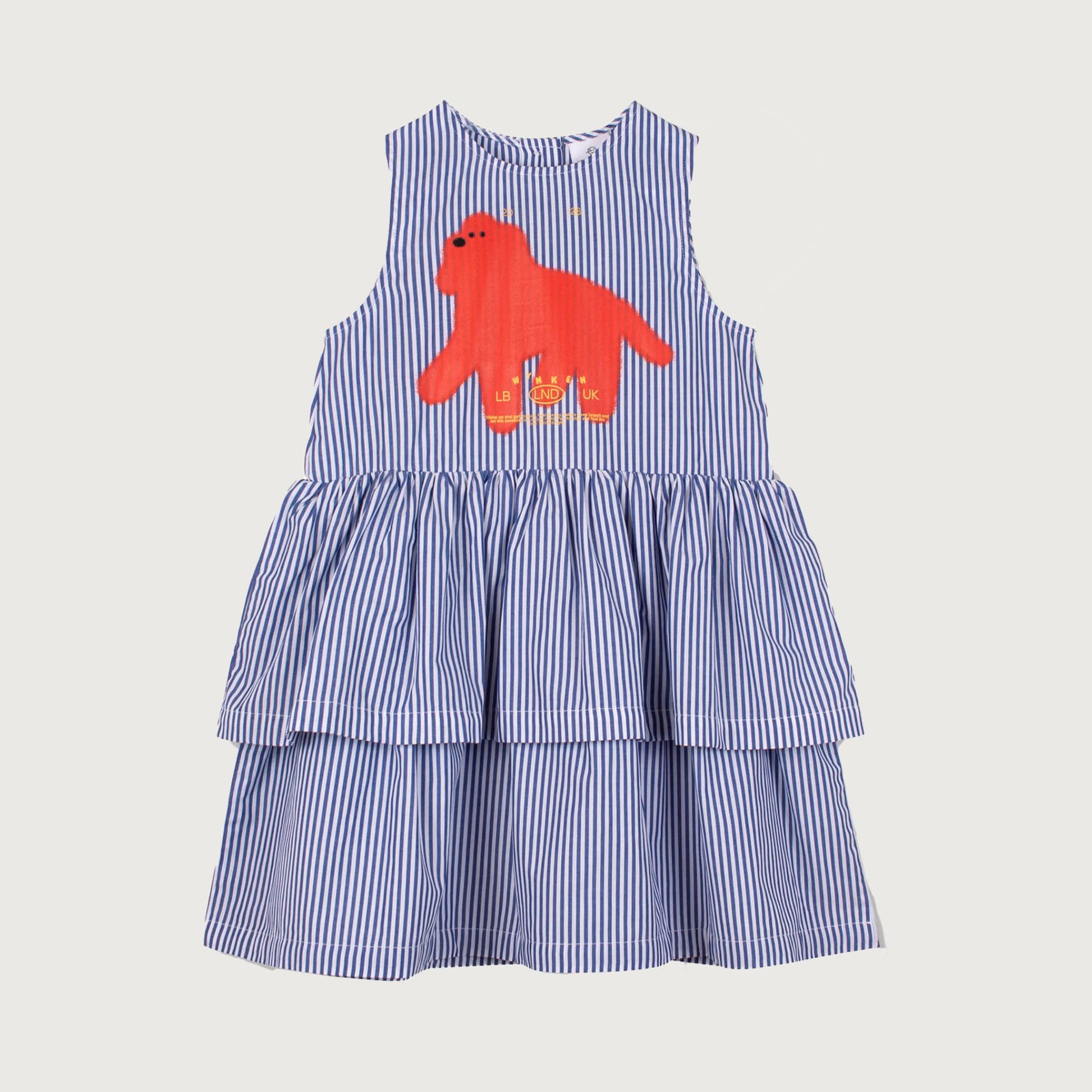 Light and soft, this dress is made from 100% cotton and ideal for warm summer days. Fine blue stripes create a fresh base, while the red dog print on the front adds a playful pop of colour. The double-layered skirt brings gentle volume and movement. Finished with a single button at the back and a small open-back detail.